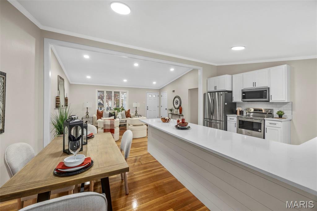 The heart of the home, the kitchen, has been completely reimagined with new cabinets, countertops, and brand-new appliances, complemented by a beautiful backsplash and vaulted ceilings.